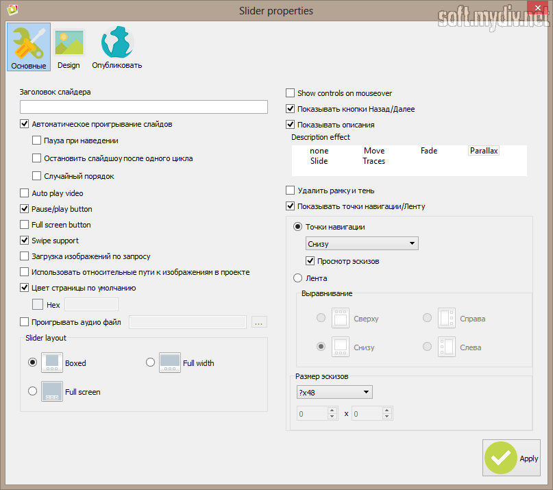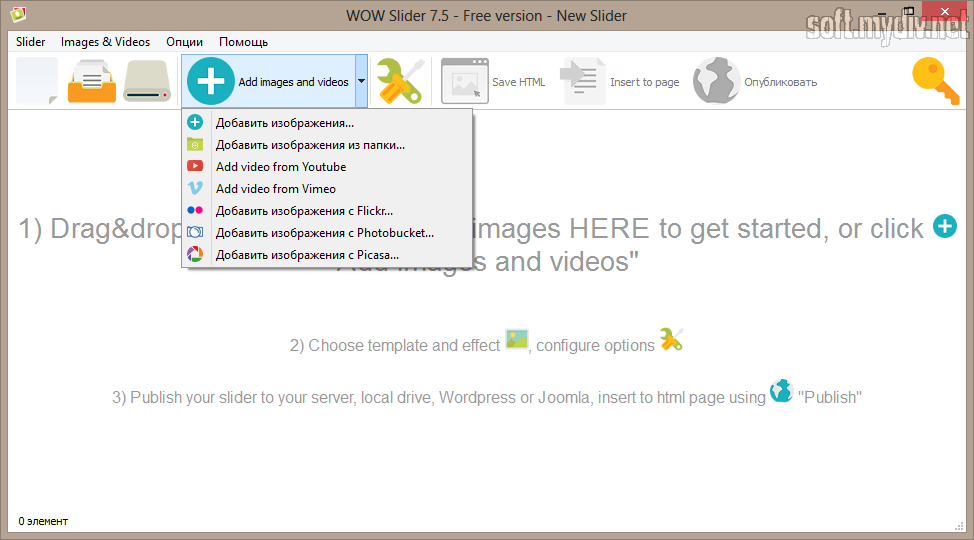 WOW Slider – простая в использовании программа, позволяющая создать слайдер для сайта. Наверное, самым главным достоинством приложения можно назвать то, что оно не требует от пользователя навыков программирования, а также предоставляет подробную инструкцию по интеграции готового слайдера в код сайта.